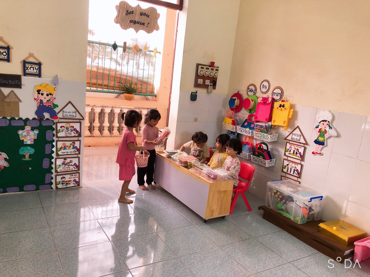 Trẻ tham gia vào các góc chơi ở lớp như: Góc bé chơi đóng vai; Góc ghép hình xây dựng; Góc thư viện sách; Góc tạo hình, Góc khám phá trải nghiệm…Ở mỗi góc chơi trẻ đều được học những kiến thức, kỹ năng khác nhau và quan trọng hơn cả là trẻ có cơ hội được thể hiện mình và biết phối hợp cùng các bạn tham gia các hoạt động.