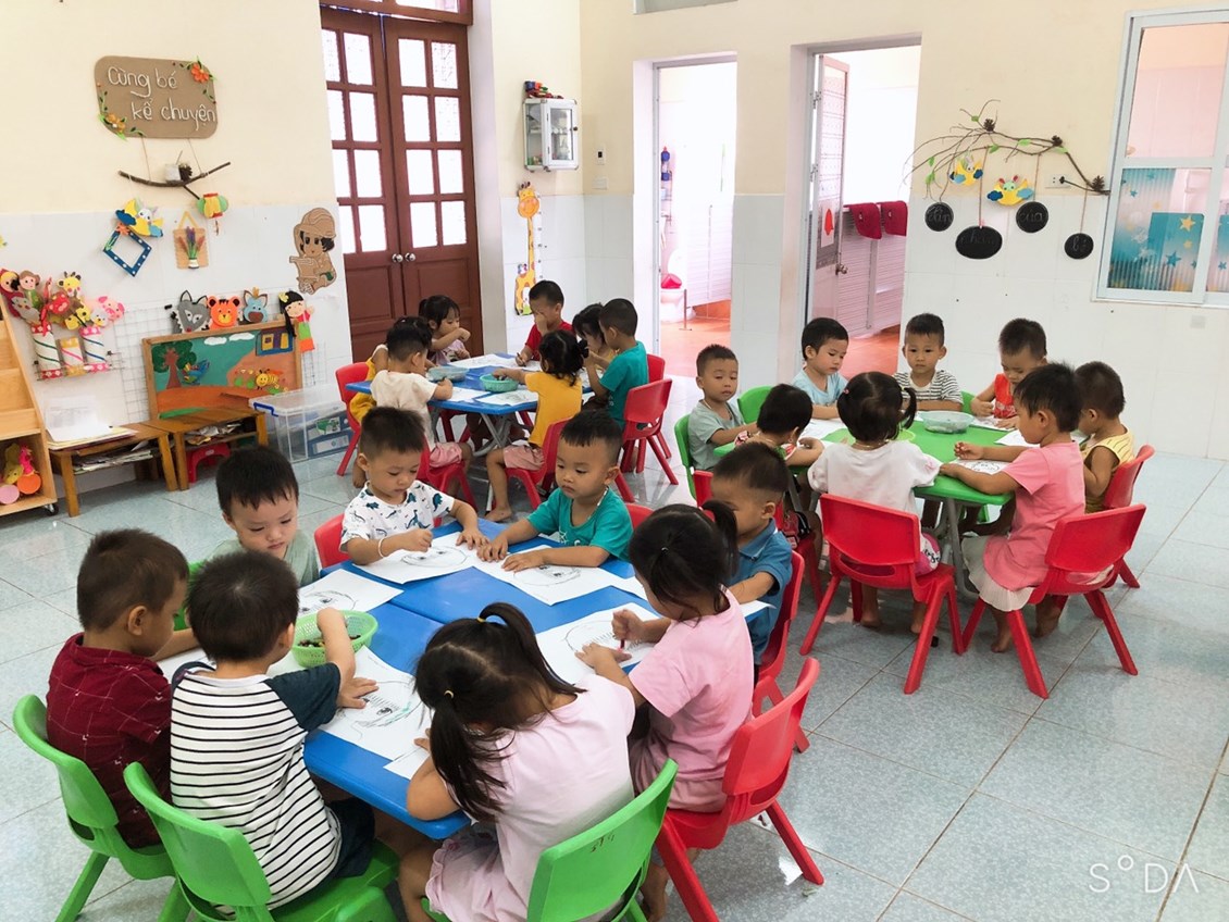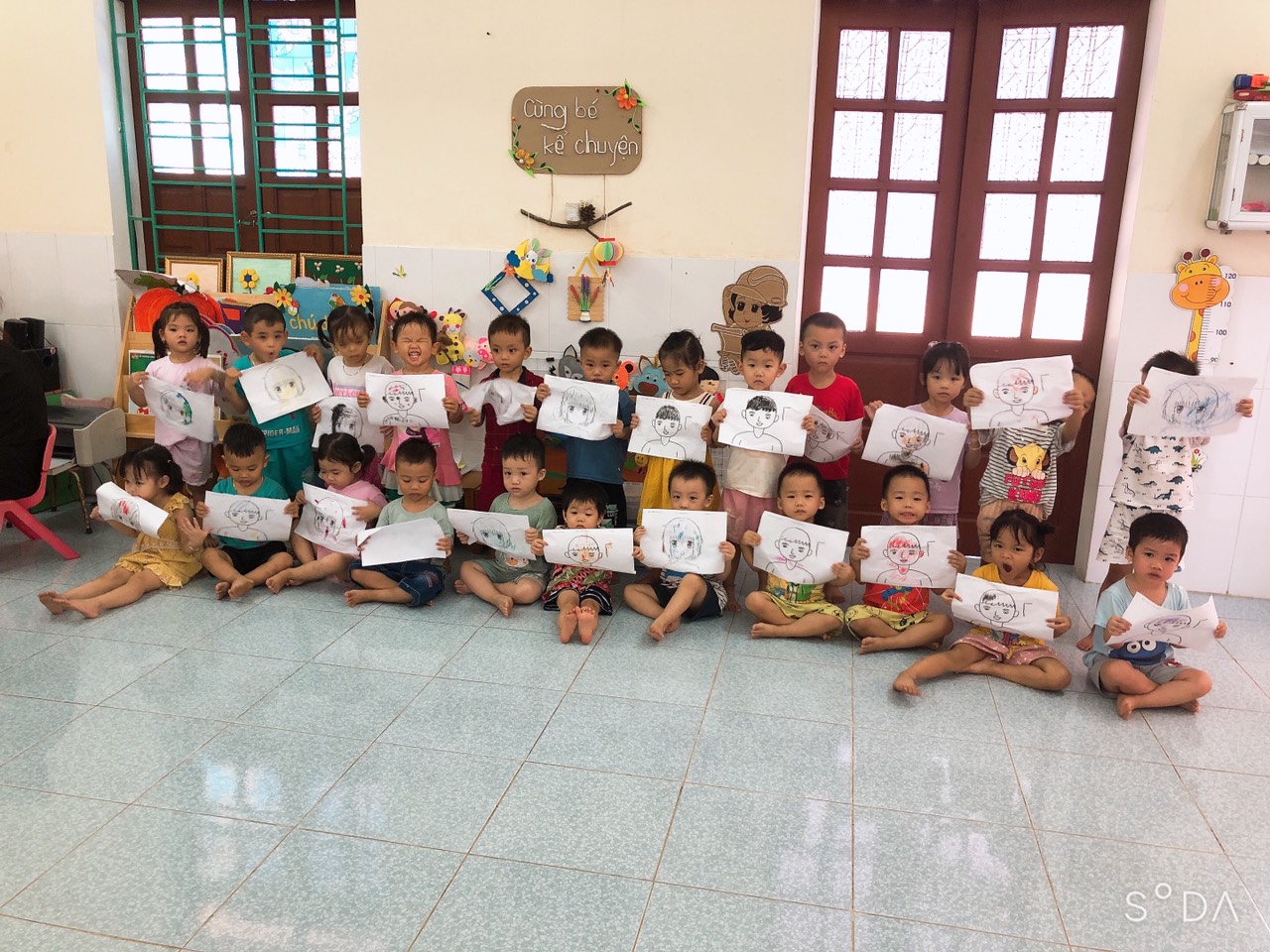 Sau khi trẻ cầm sáp màu vẽ khá thành thạo, tôi thực hiện mức độ cao hơn là cho trẻ vẽ tóc cho bạn và