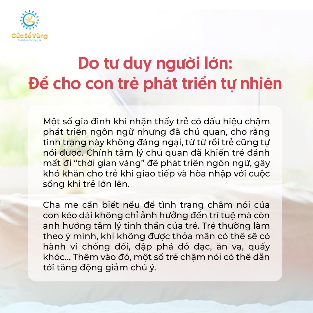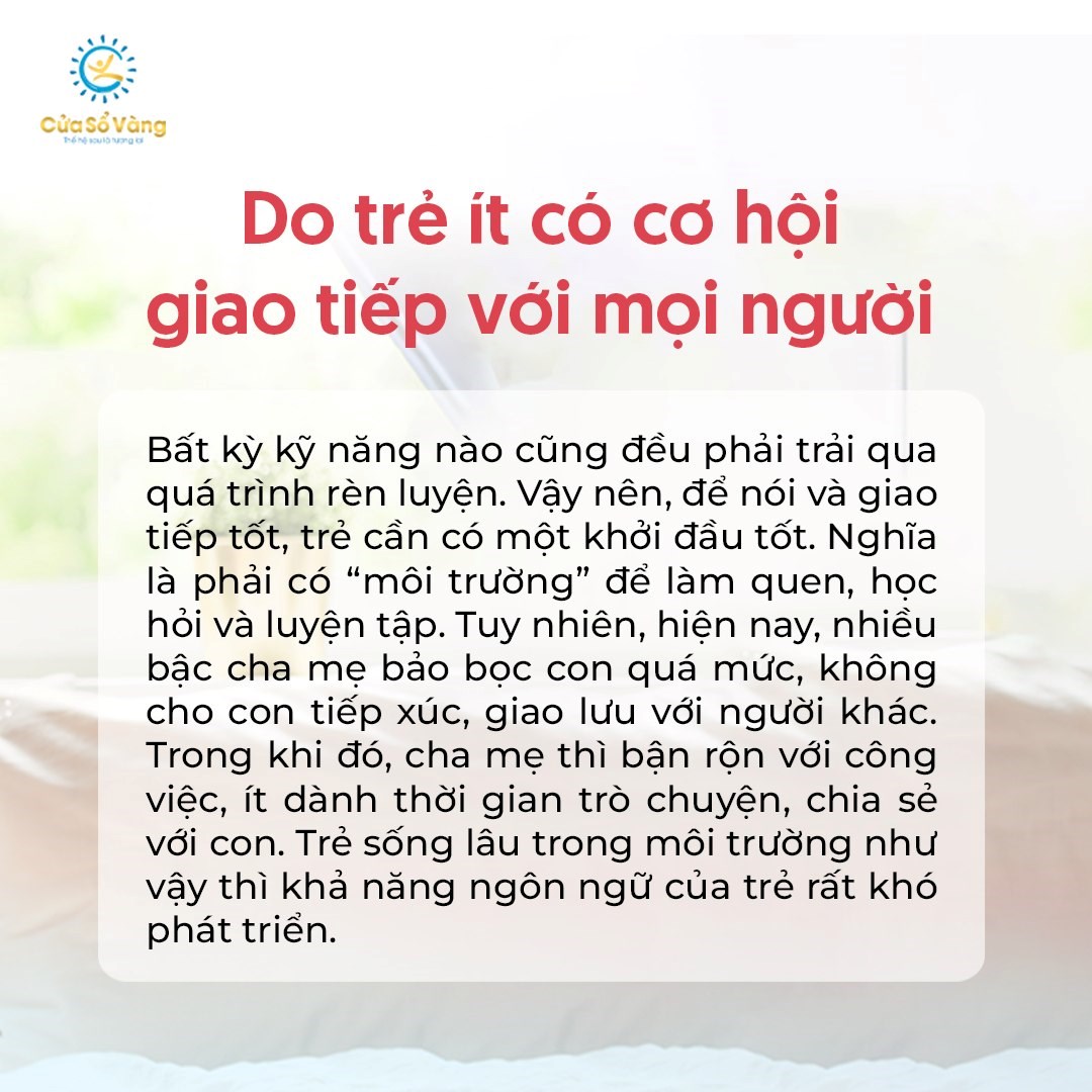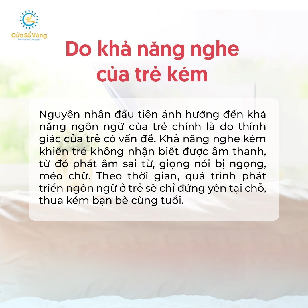 có thể bắt chước được hành động và lời nói của cha mẹ, không thể tự nói ra một câu hay một cụm từ. Trẻ cũng không thể sử dụng ngôn ngữ nói để trò chuyện và thực hiện cuộc hội thoại đơn giản, khiến người lớn gặp khó khăn trong việc hiểu những điều trẻ nói (ở mốc trẻ 2 tuổi, người lớn phải hiểu được khoảng ½ số từ trẻ nói và ¾ số từ khi trẻ 3 tuổi). Vậy trẻ chậm nói là do đâu?