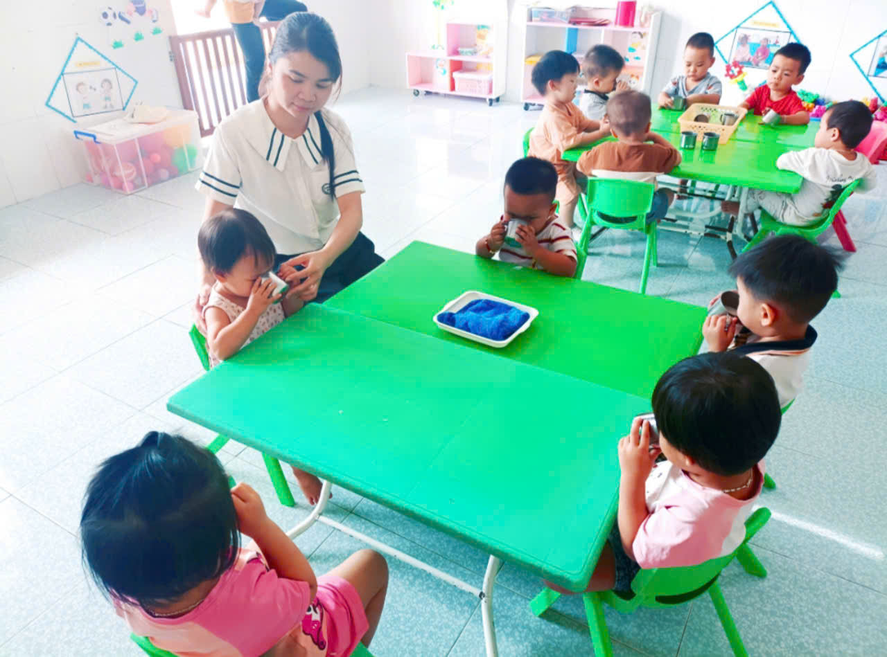 Uống sữa là một bữa phụ trong chế độ dinh dưỡng một ngày cho trẻ tại trường Mầm non Vĩnh Long. Ngoài bữa chính theo thực đơn hàng tuần ra thì bữa phụ của các cháu được nhà trường đưa vào thực đơn để nâng cao thể lực và tầm vóc cho trẻ. Các bé lớp NTD1 háo hức vào bàn ngồi ngay ngắn uống hết sữa trong giờ ăn bữa phụ. Dưới đây là một số hình ảnh của các cháu lớp NTD1 đang uống sữa.