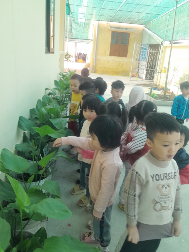 🌿 Bé khám phá: Sờ vào lá để cảm nhận độ mềm, ngửi mùi hoa thơm và lắng nghe tiếng chim hót véo von.