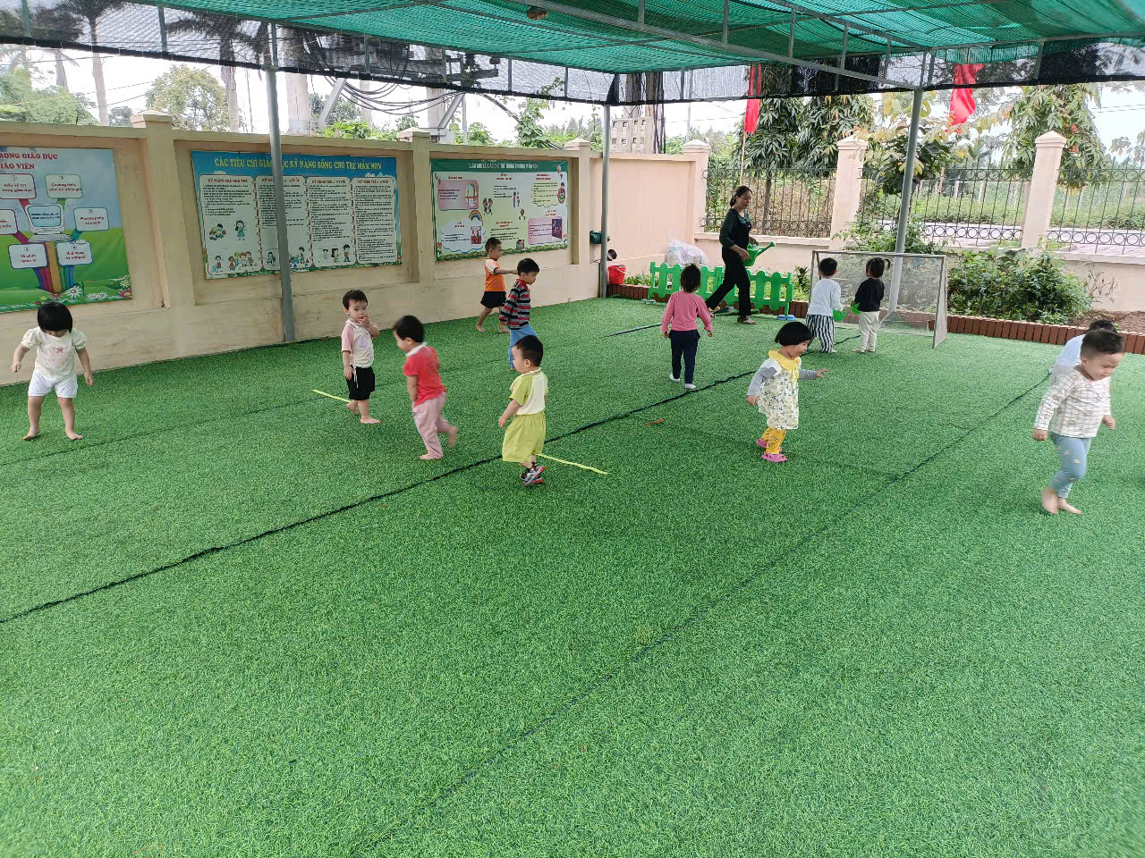 Bên cạnh đó, các hoạt động này giúp trẻ phát triển về mặt thể chất, vận động, giúp bé tiêu hao năng lượng, do đó sẽ ăn ngủ ngon hơn. Việc chạy nhảy, vui đùa, hít thở không khí trong lành sẽ giúp cho đầu óc thoải mái, sảng khoái hơn, bé sẽ tiếp thu các bài học trong lớp một cách dễ dàng hơn. Xin mời ba mẹ cùng xem 1 vài hình ảnh trong giờ hoạt động ngoài trời của các bé lớp NTD1 nhé!