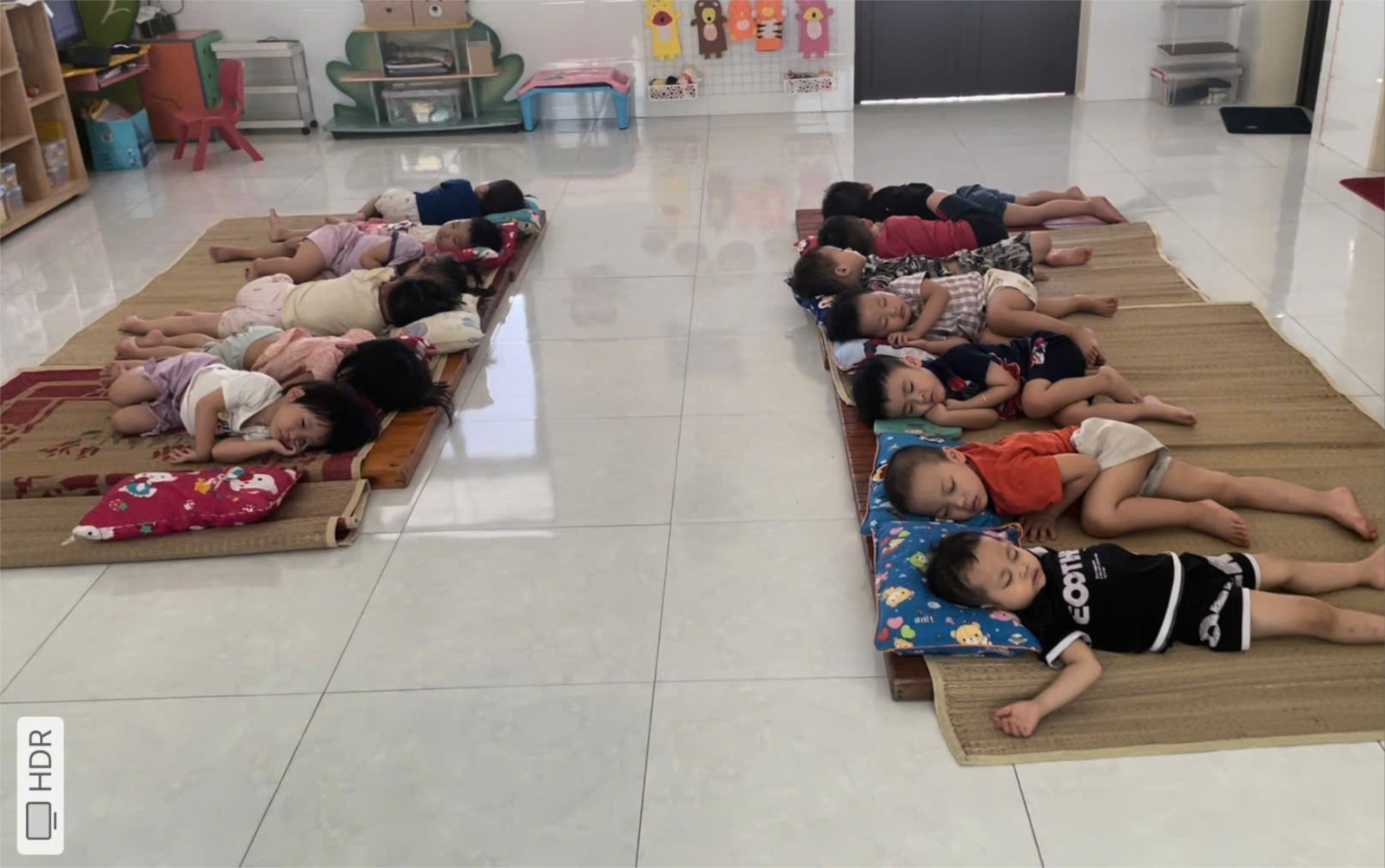 Ở trường mầm non việc tổ chức giờ ngủ trưa cho trẻ là vô cùng cần thiết. Để trẻ ngủ đủ thời gian, ngủ sâu giấc cho nên trước giờ ngủ, cô chuẩn bị các phòng gọn gàng sạch sẽ. Phòng ngủ được giảm ánh sáng bằng cách đóng bớt cửa để đảm bảo giấc ngủ cho trẻ. Cô trải phản, chiếu, cho trẻ tự lấy gối, tạo cho trẻ có thói quen tự phục vụ bản thân và nhắc trẻ đi vệ sinh trước khi đi ngủ.