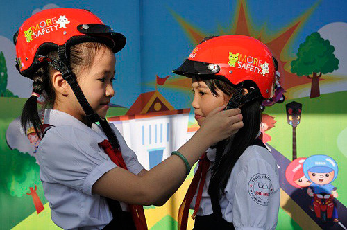 - Cho trẻ trải nghiệm tự đội mũ bảo hiểm.