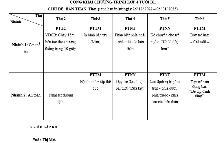 CHỦ ĐỀ: BẢN THÂN. Thời gian: 2 tuần(từ ngày 26/ 12/ 2022 – 06/ 01/ 2023)
