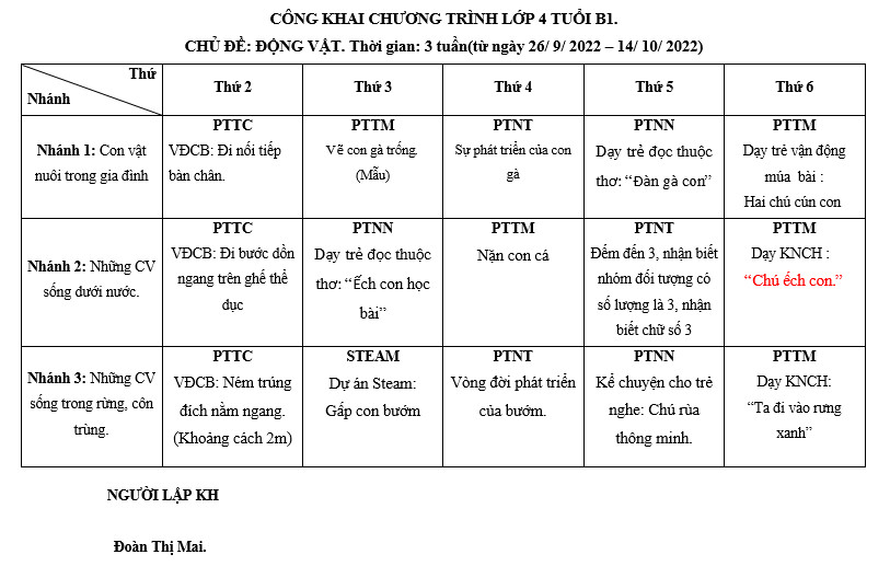CÔNG KHAI CHƯƠNG TRÌNH LỚP 4 TUỔI B1.