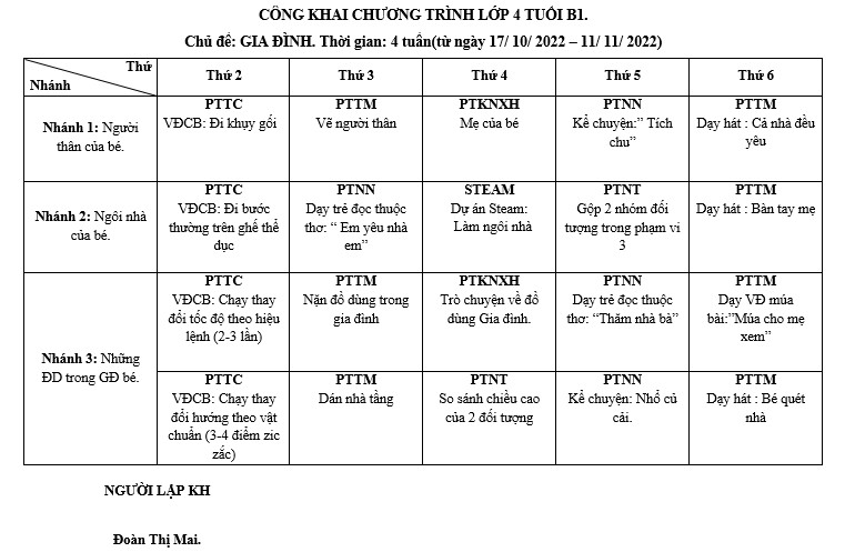 CÔNG KHAI CHƯƠNG TRÌNH LỚP 4 TUỔI B1.