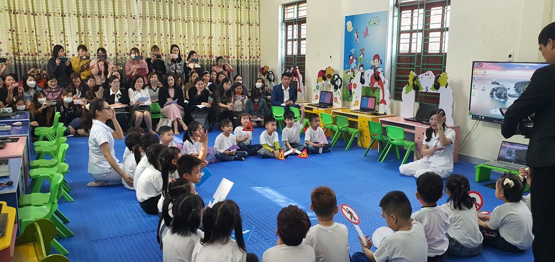 Dưới sự hướng dẫn của giáo viên, các bé lứa tuổi 5- 6 tuổi được tham gia các hoạt động khám phá “Các nhóm biển báo giao thông”; hoạt động làm quen với máy tính thông qua các trò chơi lấy từ kho học liệu về "An toàn giao thông"; tham gia giao thông qua sa hình giao thông, theo hiệu lệnh trên sân trường.