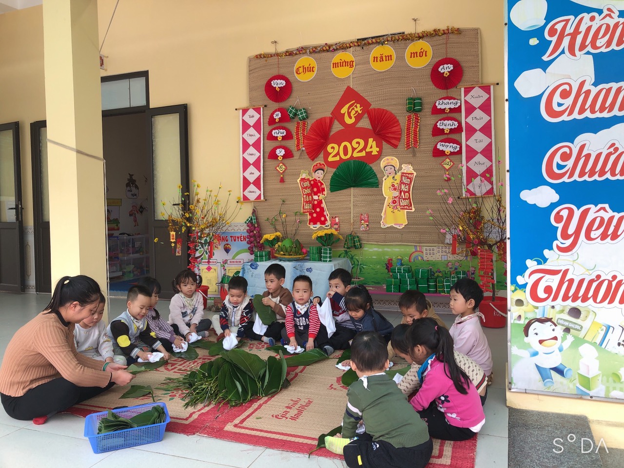 Cô và trò cùng tất bật cho công tác chuẩn bị: những chiếc lá dong được rửa sạch sẽ, các con được trải nghiệm lau lá dong