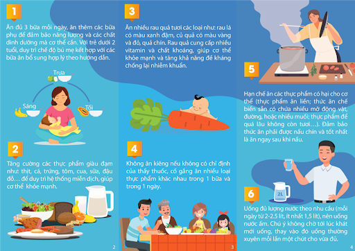 Đồ uống: Nước chiếm 60-70% trọng lượng cơ thể. Nước rất cần thiết và quan trọng đối với sức khỏe đặc biệt là trong mùa dịch. Trẻ từ 1-2 tuổi cần 600-1000ml / ngày, Trẻ từ 3-6 tuổi cần 1000-1500ml /ngày( bao gồm cả nước lọc, nước hoa quả, sữa). Cho trẻ uống nước sạch, nước đun sôi để nguội. Uống nước thành từng ngụm nhỏ và chia đều trong ngày, uống nước ngay cả khi không khát. Không nên cho trẻ uống nước ngọt, nước uống có ga, hạn chế các đồ uống có chứa cồn như cà phê.