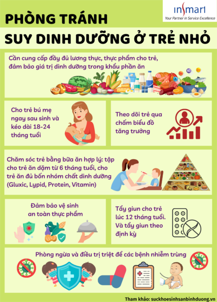 Nguyên nhân của suy dinh dưỡng là do: Trẻ ăn ít hoặc thiếu ăn nên thiếu các chất dinh dưỡng cần thiết cho sự phát triển cơ thể trẻ. Người mẹ trước và trong khi mang thai ăn uống không đầy đủ, bị thiếu dinh dưỡng sẽ đẻ ra những đứa con nhẹ cân, còi cọc, đứa trẻ suy dinh dưỡng từ trong bào thai sẽ dễ suy dinh dưỡng sau này. Trẻ bị bệnh các bệnh nhiễm khuẩn như viêm hô hấp, tiêu chảy, các bệnh ký sinh trùng,… Trẻ không được chăm sóc tốt về ăn uống, về sức khỏe ( Tiêm chủng, điều trị bệnh kịp thời…), về tâm lý, tình cảm, về vệ sinh, môi trường,…